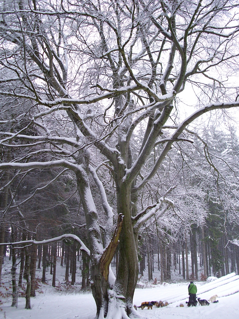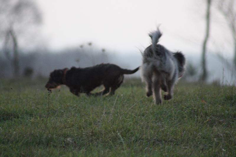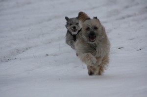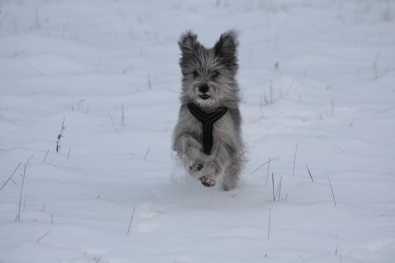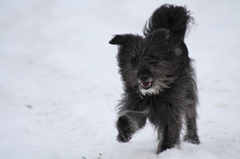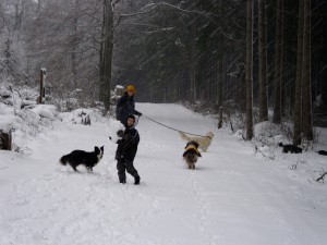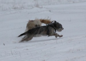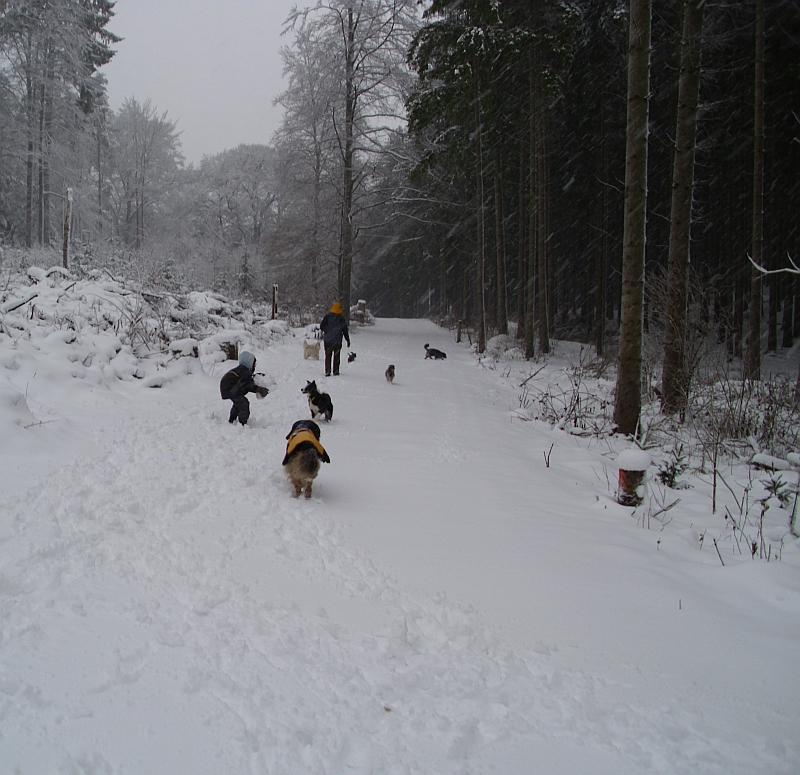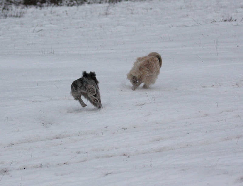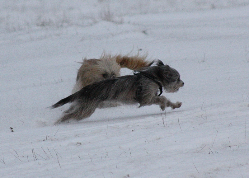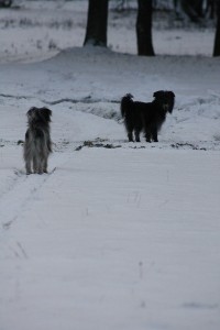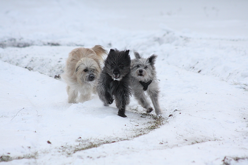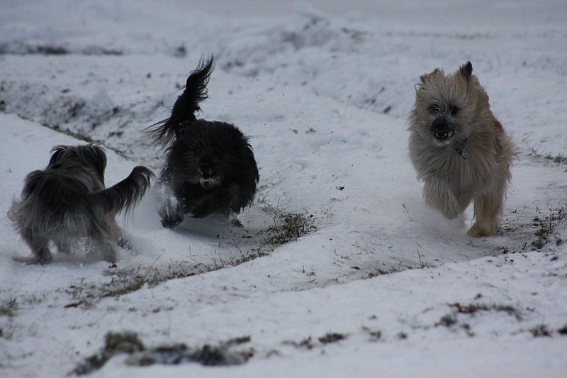 Frostige 10° unter Null, Schnee – das richtige Wetter, um sich spontan zu einem Spaziergang mit guten Freunden zu treffen. Bletta ist läufig, und da der nächste Wurf erst für Sommer geplant ist (die C´s sind jetzt knapp 8 Monate jung), musste sie zu Hause bleiben, damit sie den Herren Frodo de la petite duchesse und Agneau du petit gardien nicht den Kopf verdreht 😉 Frodo, Agneau und Das Da konnten aber durch den Schnee flitzen und sich richtig austoben. Eins ist sicher – gefroren haben sie nicht!