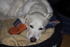 Scully hat lieber Laurins Puschen als Ohrenwärmer umfunktioniert und ist im warmen Körbchen geblieben.