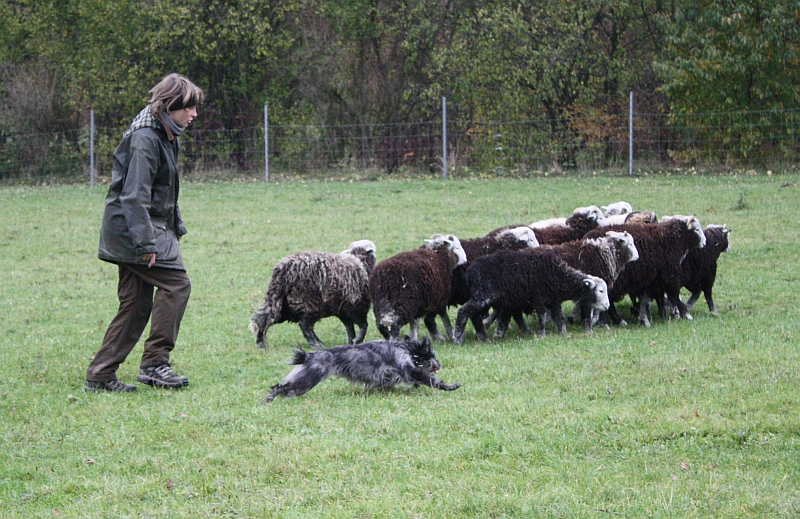 Anders als der Border Collie, der das Vieh hauptsächlich durch seine Präsenz und den fixierenden Blick („Das Auge“) bewegt, arbeitet der Pyrenäen Hütehund bei renitenten Schafen vorwiegend mit Griff und Stimme. Auf diesem Foto kann man gut erkennen, dass Bletta gezielt versucht, ein Schaf in die richtige Bahn zu lenken. Der Berger des Pyrénées wird ursprünglich für die Arbeit an größeren Herden als hier eingesetzt, wo er sich natürlich Respekt verschaffen muss. Die Arbeit an einer kleinen Gruppe (wie hier) gehört eigentlich eher nicht zu seinem Aufgabenbereich. Wir werden nun versuchen, Bletta davon zu überzeugen, dass ein größerer Arbeitsabstand an dieser Gruppe zum besseren Erfolg führt. Die Schafe, hauptsächlich Border Collies gewöhnt, waren durch den kleinen Irrwisch, der sich ihnen recht respektlos näherte (und sie auch noch anbellte, wenn sie mal nicht gleich in die richtige Richtung wollten), doch etwas irritiert… 😉