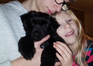 Weihnachtszeit! Im Dezember ist immer viel los, Weihnachtsfeiern, Geburtstage, Einkäufe, alles muss für Weihnachten vorbereitet werden, Paul (Legolas du Mourioche) war zu Besuch… Mairen ist mittendrin statt nur dabei, cool und entspannt schaut sie auf den diversen Feiern vorbei, wandert von Arm zu Arm (jeder will wenigstens einmal den Welpen auf dem Arm halten). Zum Reitstall durfte sie auch schon mit und das nette Voltigierpferd kennen lernen – die Neugier war auf beiden Seiten groß!