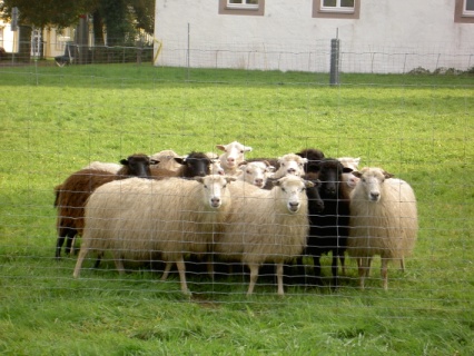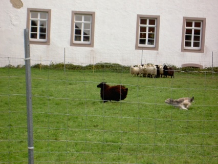 Es ist dem cbp (club berger des pyrénées) ein besonderes Anliegen, den Hüteinstinkt des Bergers in der Zukunft zu erhalten. Jährlich werden Hüteveranlagungstests durchgeführt, in denen der Instinkt der Hunde überprüft wird. Bletta hat diesen Test im ersten Anlauf nicht bestanden, da sie leider zu stürmisch war. Auf ihrem Bewertungsbogen steht "schlägt ein wie der Blitz"... Es wird jedoch gefordert, daß der Hund sich ruhig verhält, sobald die Schafe still stehen. Vielleicht hätte ich Bletta die Prüfungsordnung vorher vorlesen sollen? Zu Hause habe ich die Möglichkeit, an Schafen zu trainieren, hier zeigt sich Bletta durchaus talentiert. | ![]() |