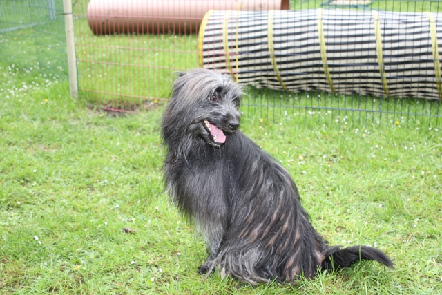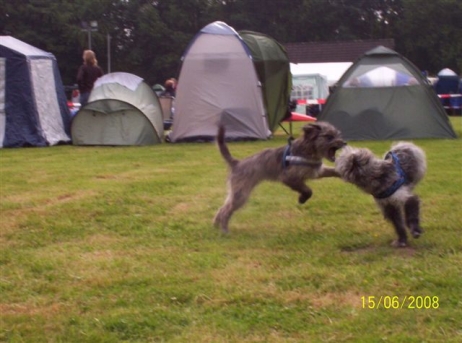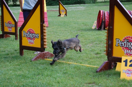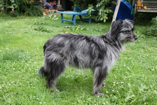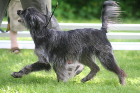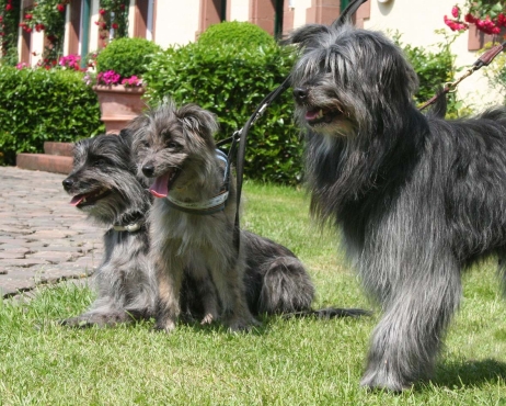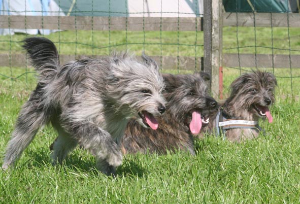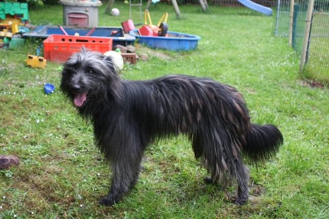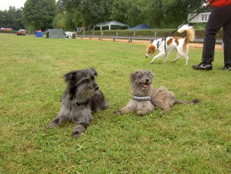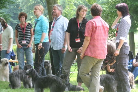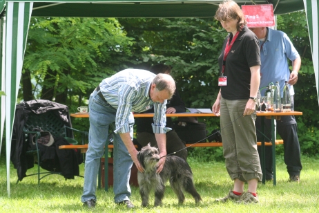 6. Juni 2009 Ein Aufwasch Gerade wurde es ruhig und fast langweilig bei uns, da überschlugen sich am Wochenende die Ereignisse... Freitag Vormittag fing es damit an, dass ich mit Bletta zum Ultraschall fuhr. Eigentlich wollte ich dieses Mal darauf verzichten, aber meine Unruhe war einfach zu groß. Alle Anzeichen deuteten zwar auf eine bestehende Trächtigkeit hin - klarer Ausfluss, Mäkeligkeit beim Fressen, vergrößerte Zitzen... - aber die Sorge, dass sich ein Desaster wie bei Scully wiederholen könnte, brachte mich um den Schlaf. Würde Bletta auch ein Einzelkind bekommen, oder sind die Vorzeichen dieses Mal besser? Ich war schon sehr nervös, aber zum Glück hat die Ultraschalluntersuchung deutlich mehr als einen Welpen gezeigt. Aussagen über eine genaue Anzahl kann man jetzt natürlich noch nicht treffen, aber ich kann auf jeden Fall beruhigt schlafen... Nun hoffe ich sehr, dass die weitere Trächtigkeit und die Geburt genauso unspektakulär verlaufen wie beim ersten Mal. Zum Freuen hatte ich auf der Fahrt ins Saarland Zeit genug, dort stand nämlich am Wochenende das alljährlich Highlight des Berger des Pyrénées Jahres auf dem Plan: Die Clubschau des cbp, dieses Jahr wieder auf dem Linslerhof in Überherrn bei Saarbrücken. Über 50 Nachwuchshunde waren am Samstag zur Ankörung gemeldet, Sonntag zur Ausstellung gab es die Rekordmeldezahl von 140 Hunden! Zum Glück bietet der Linslerhof Platz für alle, ein wirklich traumhaftes Anwesen mit einem Ambiente, das seinesgleichen sucht. Bletta konnte leider nicht mitkommen, trächtige Hündinnen sind auf dem Ausstellungsgelände nicht zugelassen, da die Infektionsgefahr und das Risiko für die ungeborenen Welpen zu hoch wären. Für Tamy (Anor), Asea und M (Arda) war es jedoch die richtige Gelegenheit, das Vermessen und die Ankörung hinter sich zu bringen - das konnte ich mir natürlich nicht entgehen lassen! Schließlich geht es darum, festzustellen, ob das Ziel, rassetypische Hunde zu züchten, gelungen ist. Doch für M stand erst noch eine andere Arbeit an: Die Begleithundeprüfung sollte abgelegt werden, sie steht immer vor dem ersten Start auf Agility-Turnieren. Leider konnte ich nicht zuschauen, weil Tamy am Vormittag bereits angekört wurde, aber das Warten auf die erlösende SMS war schon recht spannend. Nicht, dass ich an M's (oder Claudias) Fähigkeiten gezweifelt hätte, aber es goss in Strömen - nicht gut für ein Prüfung, bei der der Hund unter anderem ca. 10 Minuten auf einer Stelle liegen bleiben muss - ohne Dach über dem Kopf, versteht sich... Gegen Mittag kam die Entwarnung, alles hat prima geklappt, M hat alles tapfer mitgemacht. Herzlichen Glückwunsch noch einmal an den ersten Mourioche mit bestandener Prüfung! Wenn es sein muss, kann also auch ein kleines Teufelchen brav und artig sein... Das hat auch Tamy bewiesen, der sich morgens gleich den kritischen Augen des Vermessers und der Zuchtrichterin stellen mußte. Für die Zuchtzulassung werden mehrere Maße am Hund genommen, zum Beispiel die Widerristhöhe, die Schädelbreite, Fanglänge, Länge des Hintermittelfußes, des Oberarms und vieles mehr. Für viele Hunde ist das Hantieren am Kopf (mit der Schieblehre) recht unheimlich, hier ist das Geschick des Vermessers gefordert. Tamy hatte jedoch beschlossen, alles mit stoischer Gelassenheit über sich ergehen zu lassen, wohl in der Hoffnung, dass es so am Schnellsten vorbei ist. Guter Plan! Völlig problemlos konnten seine Maße genommen werden - stop, nicht ganz problemlos, die ausgeprägte Muskulatur an der Kruppe störte etwas beim Suchen der richtigen Punkte. Doch einen erfahrenen Vermesser kann so etwas nicht erschüttern (Hallo Herr Kagel!), und alles konnte planmäßig abgeschlossen werden. Die anschließende Beurteilung, inwieweit Tamy optisch dem Standard entspricht, ergab, dass er sich eindeutig zum Kurzhaar (Face Rase) entwickelt hat. Hier schlägt das Erbe von Blettas Eltern durch... Das Fotografieren und Laufen vor der Filmwand war keine allzu große Herausforderung und so war er rasch fertig und ist jetzt bald ein offiziell zugelassener Deckrüde. Ja, ja, aus Kindern werden Leute... Nachdem Tamy so prima vorgelegt hatte, war ich gespannt, ob seine Schwestern genauso artig sein würden. Doch wie hätte es anders sein können - beide benahmen sich absolut vorbildlich, sogar M, das kleine Flippi Flappi, konnte lange genug stillhalten, bis alle Maße genommen waren. Eine super Leistung von allen drei Teufelchen und natürlich ihren Besitzern, die die Kleinen offensichtlich perfekt auf diesen Tag vorbereitet hatten - Danke! Die gute Prägung und Erziehung ist wichtig, ein bergertypisches Aussehen ist wünschenswert, das Wichtigste von allem ist aber die Gesundheit. Daher freut es mich ganz besonders, dass alle drei Welpen, die an diesem Wochenende vorgestellt wurden, HD-frei und frei von erblichen Augenkrankheiten sind. (Aldea, die in München wohnt, ist nicht auf diese Krankheiten untersucht, daher kann ich für sie keine Aussage treffen.) Besser könnte das Ergebnis meines ersten Wurfes nicht aussehen! Und wenn wir schon mal dabei sind, steht natürlich auch die Ausstellung am folgenden Tag auf dem Programm. Tamy wurde bei den Face Rase ausgestellt und erreicht mit einem V3 eine tolle Platzierung mit einer sehr schönen Beurteilung. Asea und M mischen das Feld bei den Museau Normale auf, obwohl der Richter bei M meint, sie hätte starke Face Rase Tendenzen. Mal sehen, wie sie sich weiter entwickelt, sie braucht noch ein bißchen Zeit, um sich in die ein oder andere Richtung zu entscheiden. Alle drei haben ihre erste Ausstellung unter freiem Himmel souverän absolviert und sich auch vom zwischenzeitlichen Regenschauer nicht irritieren lassen. Beim abschließenden Fun-Turnier, das traditionell nach dem Ende des Richtens stattfindet, konnte M in ihrer Klasse den Sieg für sich verbuchen - in einer unschlagbaren Zeit flitzte sie über den Parcours, obwohl es fast knapp geworden wäre - wenn denn Ase