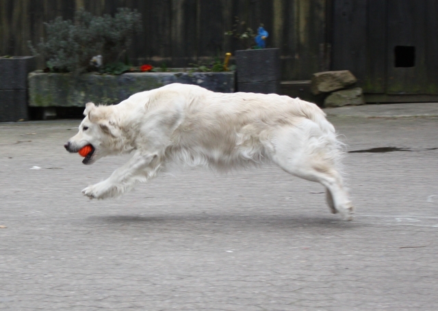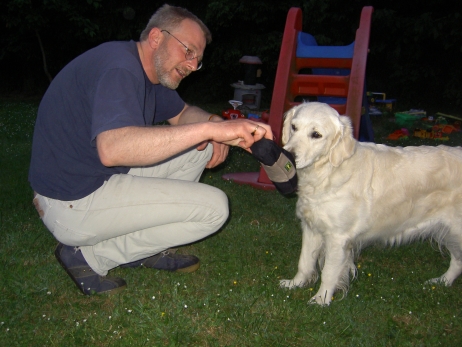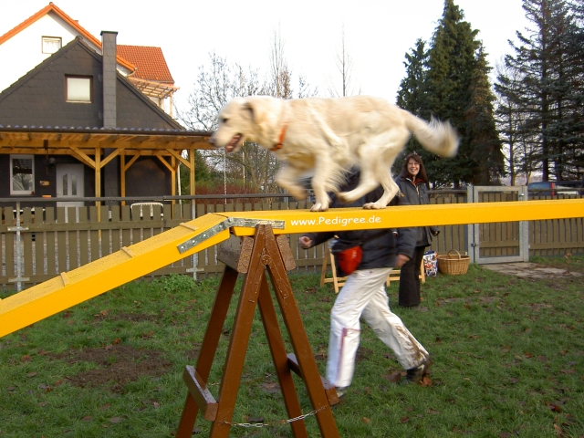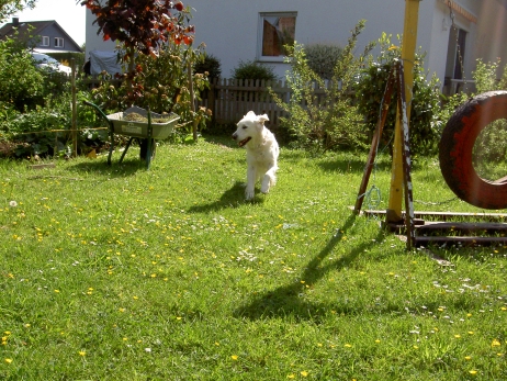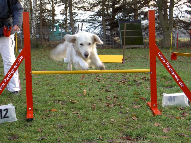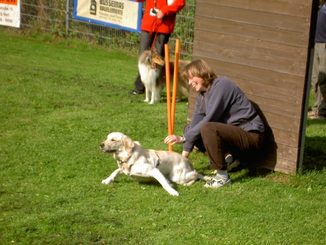 23.05.2008 Ein neuer Hund im Haus. Weich, flauschig, hellgolden und mindestens 30 kg. Öhm. Ja, das kann kein Berger des Pyrénées sein.Carstens Herzenswunsch ist in Erfüllung gegangen: Ein Golden Retriever ist eingezogen - Scarlett "Scully" vom Geesthang heisst der Neuankömmling, sie hat sich sofort gut eingelebt, liebt Laurin so sehr, dass sie ihn jeden Abend ins Bett begleitet und hüpft mit Bletta und Bonny um die Wette die Feldwege entlang. Nein, sie schläft natürlich nicht bei Laurin im Bett, nein, auch nicht auf dem Sofa, auch wenn sie es in der ersten Nacht besetzt hielt; Scully ist einfach nur lieb und toll und genau der richtige Hund für Carsten. Bletta durfte nach ihrer Babypause wieder an ihren ersten Turnieren teilnehmen - Sonntag bei uns in Lage und Donnerstag (Fronleichnam) in Menden. Es war ganz deutlich zu merken, daß wir als Team erst wieder zusammen wachsen müssen, ein halbes Jahr ohne Training muß erst wieder aufgeholt werden. Aber egal - dabei sein ist alles und in Menden hat sie tatsächlich die A3 midi gewonnen, da kein anderer Midi-Hund den Parcours fehlerfrei absolvieren konnte. Tamy darf jetzt auch regelmäßig am Training teilnehmen - Baby-Agility ist angesagt, Spiel und Spaß, er findet es toll. Er zeigt sich jetzt schon sehr triebstark, dabei aber stets bemüht, alles richtig zu machen. Und was mich ebenfalls sehr freut: Alle, die seine Schwestern bisher auf diversen Turnieren gesehen haben, konnten nur Gutes über sie berichten. Es ist schon sehr lustig, daß ich mich mit Bletta auf den Start vorbereite und eine "Mitstreiterin" plötzlich fragt, ob das denn wohl die Mama vom "M" sei... ![]() ![]() ![]() ![]() ![]() ![]() ![]() ![]() ![]() ![]() ![]() ![]() ![]() ![]() ![]() ![]() |