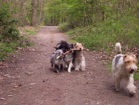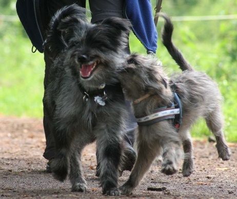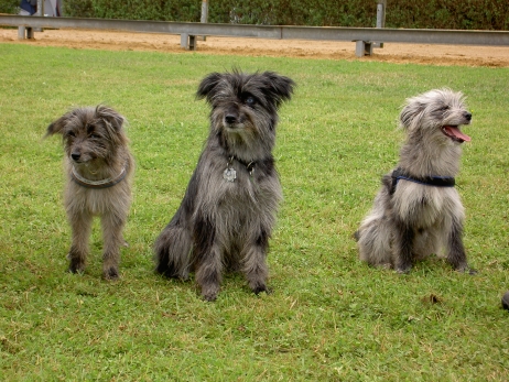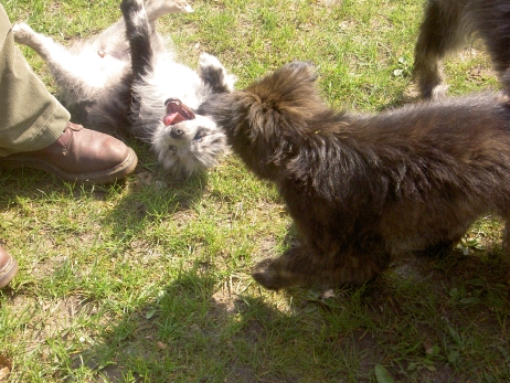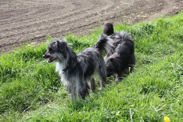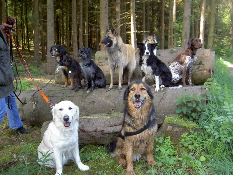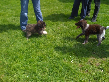 20.04.2008 Familie Paech (Berger de Pyrénées "vom Heidetal") hatte heute zum Zuchtstättenspaziergang eingeladen und Bletta, Tamy (Anor) und Asea durften auch teilnehmen. Bletta und Tamy wurden von mir und Carsten begleitet, Asea kam mit ihrer neuen Familie - Klaus und Renate. Tamy und Asea haben sich gleich wiedererkannt und unermüdlich miteinander gespielt. Auch Bletta hat sofort zurück in ihre Mutterrolle gefunden und für Zucht und Ordnung gesorgt. Die beiden Kleinen waren völlig unbeeindruckt von den vielen fremden Hunden und knüpften rasch jede Menge neue Kontakte. Es ist schön zu sehen, daß aus den winzigen Hundebabies, die eher Meerschweinchen als Hunden glichen, selbstbewußte und unerschrockene Persönlichkeiten geworden sind, die jedermann freundlich begrüßen. Genau so hatte ich es mir erhofft! Auch die Berichte und Fotos, die ich von M (Arda) und Patty (Aldea) bekommen habe, spiegeln nur Gutes wieder. Ein deutliches Zeichen, daß alle neuen Familien auf dem richtigen Weg sind und auftretende Problemchen im Keim ersticken. Vielen Dank auch für die Fotos, die mir ab und an zugeschickt werden, ich veröffentliche hier gerne eine Auswahl davon. Beim heutigen Spaziergang war es mal wieder sehr beeindruckend zu sehen, wohin konsequente Zucht auf Dauer führen kann. So viele Hunde aus einer Zuchtstätte sieht man wohl selten auf einem Haufen und bei allen war eine gewisse Ähnlichkeit erkennbar. Eine tolle züchterische Leistung, finde ich. Ob wir dieses Ziel auch einmal erreichen werden? |