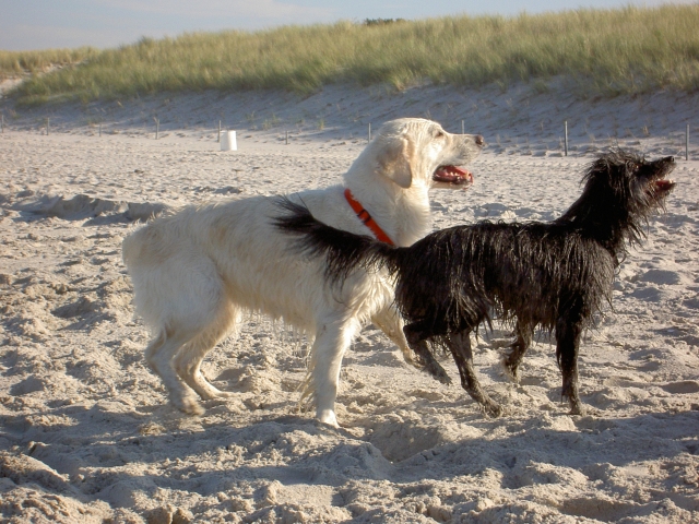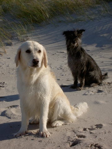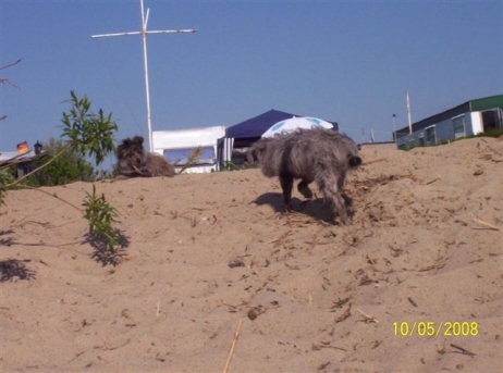 04.05.2008 Urlaub! Man gönnt sich ja sonst nichts - eine Woche Dänemark "unten links", an der wunderschönen Nordseeküste. Ausgangspunkt für unsere Wanderungen und Strandexpeditionen war Vejers Strand, dort hatten wir ein kleines und im zweiten Anlauf auch feines Häuschen gemietet. Eine Woche die große Freiheit, ein unendlicher Strand, wunderschöne Dünenlandschaften und völlig streßfreie Hundebegegnungen. Laurin hat sein Bestes gegeben, den Strand von unten nach oben zu buddeln und das Meer in seinen Gummistiefeln nach Hause zu bringen. Falls der Meeresspiegel in den letzten Tagen gesunken ist - wir sind schuld... Digger war völlig entzückt über die vielen netten jungen Damen (vierbeinig natürlich), die allesamt einer Bekanntschaft nicht abgeneigt waren und ist spontan 10 Jahre jünger geworden - leider jeweils nur kurzfristig. Bletta war schwer damit beschäftigt, ganz nach Berger-Manier alles im Blick und unter Kontrolle zu behalten und Bonny fand's einfach nur toll - die Bälle flogen mit Rückenwind viel weiter als zu Hause, außerdem kann man sich in dem schönen hellen Pudersand wunderbar wälzen. Schön war's, und Dänemark kann man für einen Urlaub mit Hunden wirklich nur empfehlen. Und kaum wieder zu Hause, die nächste Freude: Neue Fotos von M und Patty, beide scheinen ihre neuen Familien schön auf Trab zu halten... Aber so ist das halt - wer sich für einen Berger des Pyrénées entscheidet, vergißt ganz schnell, was "Langeweile" ist. ![]() ![]() ![]() ![]() ![]() ![]() ![]() ![]() ![]() |