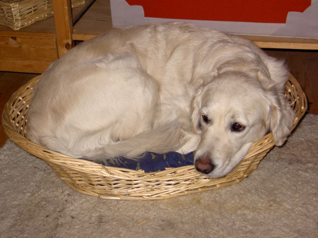 12. Juli 2009 Die Spannung steigt Heute ist der errechnete Geburtstermin, wenn man vom ersten Decktag zählt. Bletta wird immer runder, ansonsten tut sich noch nichts. Das ist aber nicht weiter beunruhigend, denn zum Einen sind die 63 Tage zwischen Decktag und Geburtstermin nur Durchschnittswerte (plus/minus 7 Tage sind noch in der Norm) und zum Anderen waren wir ja fünf Tage zum Decken - vom letzten Tag an gerechnet ist es also noch nicht so weit. Uns bleibt nur zu warten, dass die Natur ihren Lauf nimmt. Die Kleinen sind schon recht energisch, ihre Bewegungen sind bereits deutlich zu sehen. Bletta ist trotz ihres für ihre Verhältnisse gewaltigen Umfanges noch recht leichtfüßig und begleitet uns nach wie vor auf allen Spaziergängen. Schwangerschaftsgymnastik hält fit für die Geburt! Zu Hause liegt sie jedoch bevorzugt in ihrem Körbchen und genießt die seltene Ruhe. Wir freuen uns schon sehr auf die Kleinen und sind gespannt, wann es wohl soweit ist. |