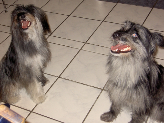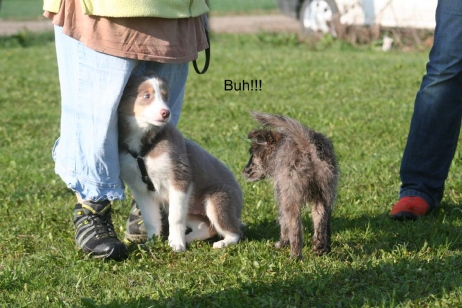 Juli 2008 Versuche, bei den European Open ein paar schöne Fotos von Asea, M (Arda) und Bletta zu machen, endeten wie folgt: Ein Bild sagt mehr als tausend Worte: Wenn es regnet, ist es bei "Papa" am Schönsten - und die Aussicht ist viel besser als in Normalhöhe! Ein bißchen Kuscheln zwischendurch ist auch ganz nett... Jetzt aber: M (Arda) auf dem Weg zum Fotoshooting. Und wann kommt endlich das blöde Vögelchen? M und Bletta - bei zwei Shootingstars lässt sich das noch handeln. Zumindest, wenn einer der beiden schon weiß, was er zu tun hat. Bei M und Asea wird's dann schon spannender. Beide gleichzeitig hübsch gucken??? Schon schwierig! Jetzt wollen wir es aber wissen und alle drei zusammen auf einem Foto verewigen. Bletta findet die Idee doof und überhaupt alles sehr albern. Komische Sachen, die M da abzieht. Aber was ein echter Berger ist, der läßt sich auch mal bestechen. Na ja, fast zumindest. Besser