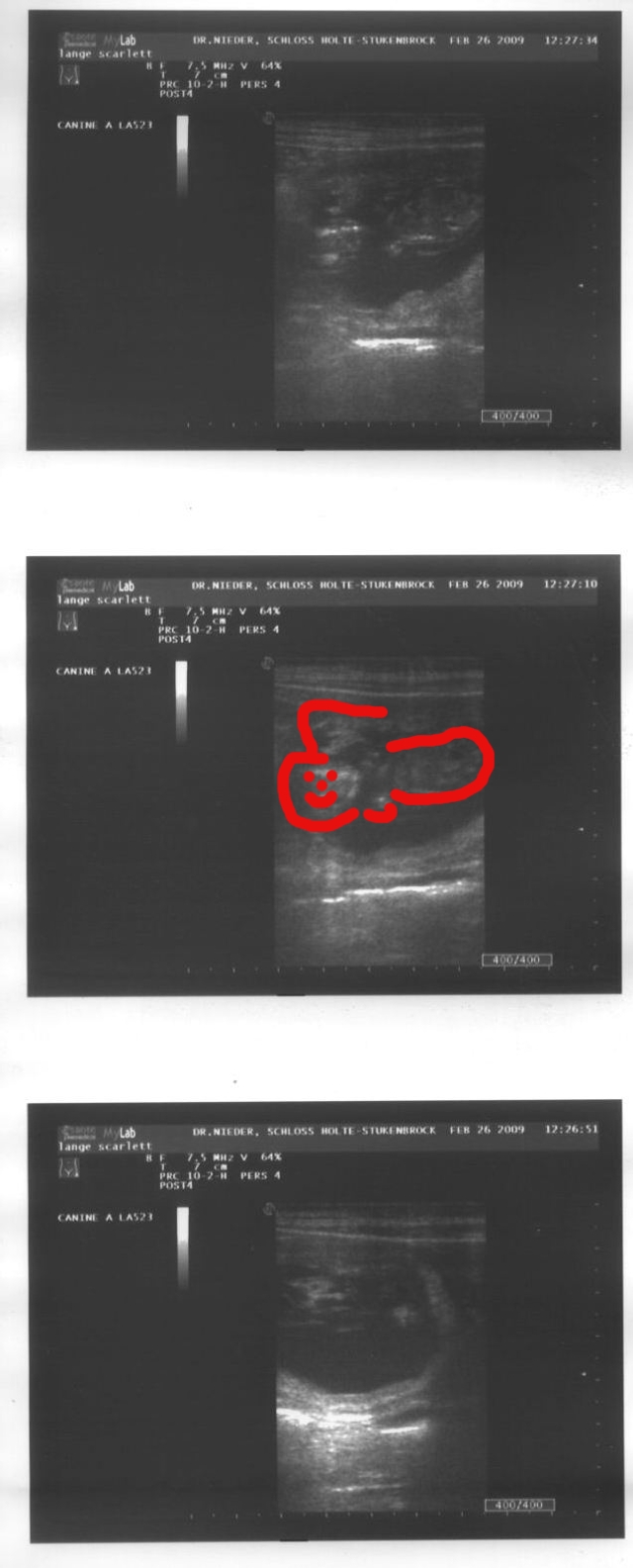 28. März 2009 Jetzt sind wir schon ein paar Tage drüber, aber weiterhin wohlauf. Eine verlängerte Trächtigkeitszeit ist bei Einlingen nicht ungewöhnlich, auch läßt sich der Eisprungtermin ja nicht genau festmachen.Montag haben wir den nächsten Termin zum Ultraschall. Heute war alles gut, das kleine Herzchen schlägt 140 mal in der Minute, Scully sieht das alles gelassen. Bleiben uns ausgedehnte Spaziergänge, treppauf, treppab, Bällchenspiele. Warten... ![]() |