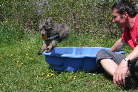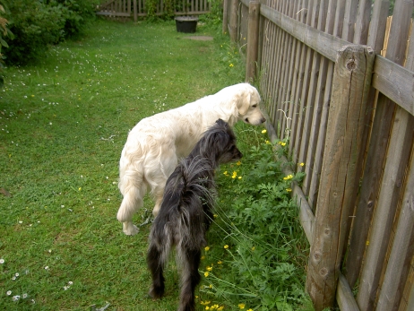 3. Juli 2009 Der Countdown läuft Nun sind es nur noch wenige Tage bis zum errechneten Geburtstermin und wir harren erwartungsvoll der Dinge, die da kommen werden. Bletta geht es prima, die Spaziergänge haben wir wegen der großen Hitze auf die Morgen- und Abendstunden verlegt, zusätzlich gibt es Schwangerschaftsgymnastik in Form von Schwimmen - eine willkommene Abkühlung, zu denen die Sennebäche gerne einladen. Ihr Bauch wächst und wächst, allerdings trägt sie die Plautze diskret auf der Unterseite versteckt, die Seiten beulen noch nicht sehr aus. Es ist aber schon deutlich zu spüren, wie die Kleinen ihre Aerobicübungen absolvieren, sind es zuerst nur leichte Berührungen, kaum wahrnehmbar, so treten sie jetzt von innen durchaus recht energisch gegen die aufgelegte Hand. |