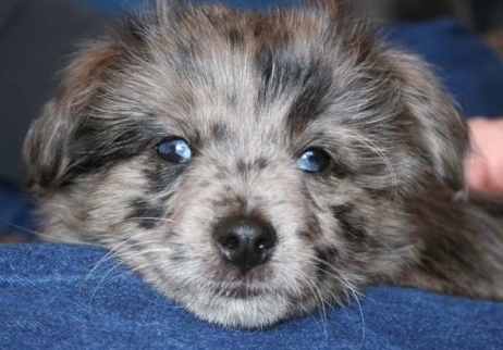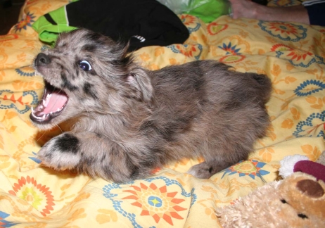 Und gleich am nächsten Wochenende dann Dortmund. Besonderer Höhepunkt für mich: Klaus wird Asea ausstellen! Auch hier bin ich wieder viel nervöser als der Rest der Welt - besonders Klaus ist völlig entspannt und er führt Asea vor, als hätte er das schon tausendmal gemacht. Auch von Aseas Showeinlagen läßt er sich nicht irritieren. Die kleine Teufelin hat nämlich irgendwann beschlossen, daß sie jetzt lange genug ruhig und brav war und nun ist Spielzeit. Sie hatte die Lacher auf ihrer Seite, als sie versuchte, die andere Hündin im Ring zu bespielen. Auch die Richterin Frau Großpietsch war deutlich amüsiert. Aber zum Glück ließ Asea sich davon überzeugen, noch ein bißchen durch den Ring zu traben - auch wenn sie die vermeintliche Spielgefährtin dabei nicht aus den Augen ließ. Ihr Ausstrahlung und Lebensfreude wird auch in der Beurteilung hervorgehoben und ich glaube, der Asea-Fanclub hat ein paar neue Mitglieder. Frau Großpietsch beurteilte Asea so: "9 Monate alte Mittellanghaar Harlekin Hündin von vorzüglichem Typ und Ausdruck, vorzügliche Kopfproportionen, sehr dunkle Augen, bestes Pigment, vorzüglich angesetzte und getragene 1/2 Steh-Kippohren, sehr beweglich, vorzüglicher Hals, vorzügliche obere Linie, vozügliche Kruppe, vorzüglich angesetzte, meist über der oberen Linie getragene Rute, vorzügliche Winkelung der Hinterhand, korrekt im Stand, in der Präsentation, im Stand in der Bewegung rassetypisch, Lebensfreude ausstrahlendes Verhalten. Vorzügliches Haarkleid in Länge, Textur und Verteilung, hervorzuheben ist die vorzügliche großflächige Harlekinmarkierung. Gekonnte Vorführung. Vielversprechend, Platz 1." |