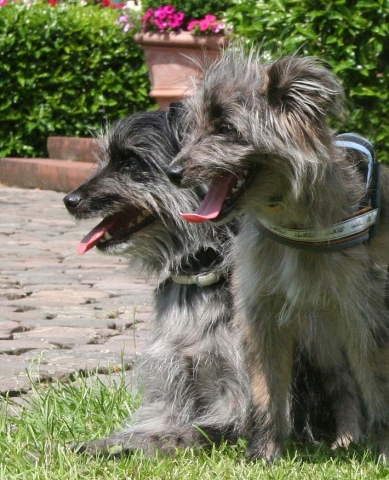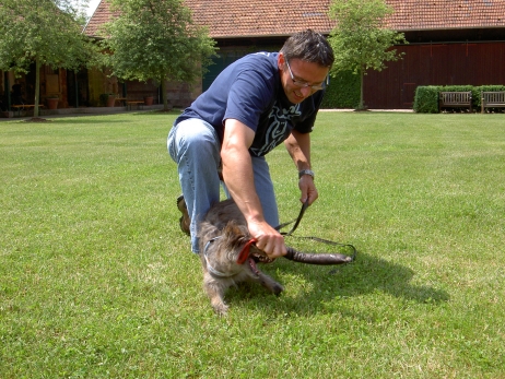 Juli 2008 Ereignisreich, aufregend, anstrengend, unvergeßlich, erfolgreich - das alles bot der Juli in seinen letzten Tagen. Es begann mit dem Hütetest des cbp, der am 19.07. stattfand. Bletta erreichte hierin 8 von 9 möglichen Punkten, dynamisch und triebstark versuchte sie, den Schafen zu zeigen, wo es ihrer Meinung nach langgeht. Wie man im Video sehen kann, wäre stellenweise durchaus etwas weniger Druck angezeigt gewesen, an anderen Stellen hat sie sich aber wieder zurückgenommen und angemessen reagiert. Und wenn die Schafe aus der blöden Ecke nicht rauswollen, muß Berger ja schließlich nachhelfen... Am 20.07. besuchte ich die Agility European-Open in Gelsenkirchen. Ein Agility-Event dieser Größe mit über 650 Startern und dann auch noch in erreichbarer Nähe - das kann man sich einfach nicht entgehen lassen. Leider war das Wetter dem Ereignis nicht angemessen, es goss in Strömen - und das schon seit Tagen. Meiner Stimmung tat das aber keinen Abbruch, konnte ich doch endlich Asea und M (Arda) wiedersehen. Beide überzeugten durch ihre absolut offene und freie Art und ihr ausgepägtes Temperament. Bletta schlüpfte sofort in ihre Mutterrolle (pubertierende Kinder müssen erzogen werden!), Bonny war sichtlich genervt, dass das junge Gemüse auf einmal wieder da war und ihr ständig die Lefzen lecken wollte. Bäh! Zu sehen, wie die beiden ihre neuen Familien um die kleine Kralle wickeln und von allen geliebt werden, war ein tolles Gefühl. Es ist deutlich zu merken, wieviel Arbeit und Liebe Klaus und Jörg in ihre kleinen Teufel bisher schon gesteckt haben - sicherlich unterstützt von Renate und Claudia, ein Welpe ist ja meistens ein "Familienprojekt". Ab Montag, den 21.07, ein weiterer Höhepunkt: Agility-Seminar mit Silvia Trkman und Polona Bonac, zweimal drei Tage für mich, also bis Samstag. Die ersten drei Tage durfte Bonny teilnehmen, danach war Bletta an der Reihe. Soviele Informationen in so kurzer Zeit - unglaublich. Dazu kamen die Kapriolen des Wetters, von strömendem Regen früh bis spät bis brütender Hitze den ganzen Tag war alles dabei. Ich habe eine Menge Hausaufgaben mit nach Hause genommen, die Übungsstunden in den nächsten Wochen werden auf jeden Fall nicht langweilig. Alleine schon, Silvia und Polona mit ihren Hunden zu beobachten, ist eine Reise wert. Eine unglaubliche Harmonie, geprägt von gegenseitigem Respekt und dem Wunsch nach vollkommener Kommunikation. Dazu die Fähigkeit, sich auf jeden einzelnen Seminarteilnehmer einzustellen und für jeden noch ein bißchen zu verbessern. Besonders erstaunlich war zu sehen, dass Silvias La vor Power fast platzte - nur wenige Wochen zuvor war sie nach einer schweren OP dem Tode nahe. Einzelheiten darüber finden Sie auf der Homepage von Silvia. Ich hoffe, daß La bald völlig wiederhergestellt sein wird - sie ist ein echter "One in a million"-Hund! Das Erlernte konnten wir dann direkt am 27.07. beim Turnier des cbp - ausgeschrieben als Verbandsmeisterschaft - anwenden. Na ja. Zumindest in der Theorie. In der Praxis sah es eher so aus, dass die vorangegangenen Tage nonstop-Agility sowohl bei meinen Hunden als auch bei mir deutliche Spuren hinterlassen hatten. Die Konzentrationsfähigkeit meinerseits tendierte gegen Null und bei Bonny und Bletta war ein deutlicher Abfall im Tempo zu merken. Trotzdem gelang Bletta der Sieg in der cbp-Kombiwertung und als Verbandsmeister ist sie nun für die VDH-DM am 6.12. in Großefehn qualifiziert. Nach cbp-Angaben wird es das erste Mal sein, daß der Club Berger des Pyrénées mit einem Starter auf der VDH-DM vertreten ist. Und das auch noch mit einer Hündin, die nicht nur Sport betreibt, sondern auch erfolgreich an Ausstellungen teilnimmt und aktiv im Zuchtgeschehen mitmischt. |