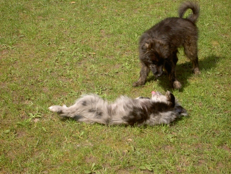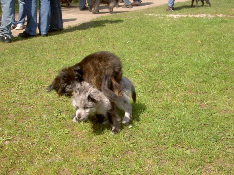13. Mai 2009 Übung macht den Meister! Da Blettas Loverboy Kresken nicht weit weg wohnt, nutzen wir die Gunst der Stunde und fahren regelmäßig zum Nachdecken - sicher ist sicher... So kann Kresken seine Technik perfektionieren und fleißig üben. Er, der ansonsten Fremden gegenüber eher zurückhaltend ist, begrüßt mich an der Tür wie eine alte Freundin. Kaum zu glauben, er springt mir bis in Augenhöhe und freut sich wie ein Irrwisch, schließlich hat er schnell begriffen, daß ich immer das "Lecker Mädchen" dabeihabe. Da Kresken keinen eigenen Garten hat, fahren wir immer ein Stückchen zu einem ungestörten Feldweg, auf dem kein Verkehr herrscht. Im Auto ist er schon außer Rand und Band und kaum steigen wir aus, hat er nur noch Augen für Bletta. Einmal kurz markieren und schon geht's zur Sache, sehr zur Begeisterung von Bletta, die auch keine Lust auf ein langes Vorspiel hat. Küsschen geben, Öhrchen lecken - papperlapapp, dafür sind wir doch nicht dorthin gefahren... Die beiden sind wirklich ein tolles Paar, im Ganzen sehr harmonisch, sowohl im Aussehen als auch im Verhalten. Ich bin schon sehr gespannt auf unsere "karierten" Welpen und hoffe, daß alles einen normalen Gang nimmt - der Schreck von Scully sitzt bei uns doch noch recht tief. Nun hoffen wir auf einen guten Verlauf. Vielen Dank an Martina und Lucius, daß sie mir seit Sonntag täglich Zeit schenken und mir ihren tollen Rüden zur Verfügung stellen. |