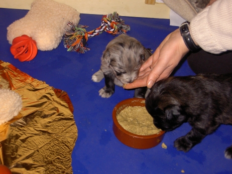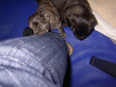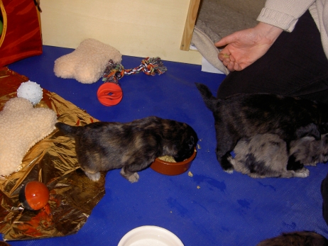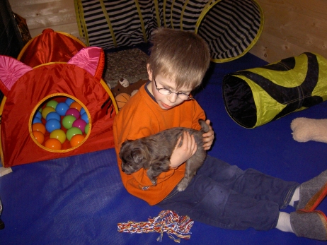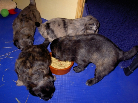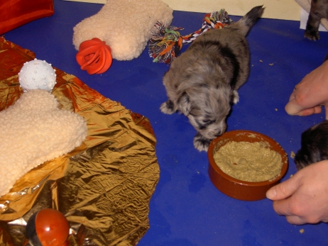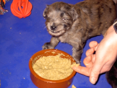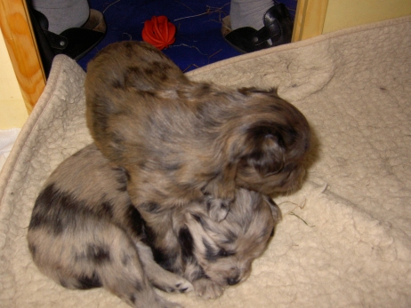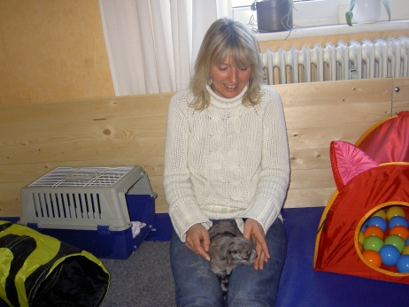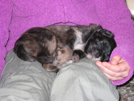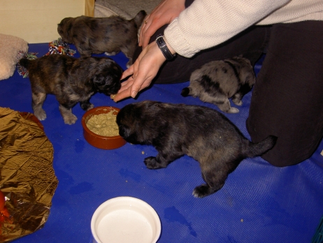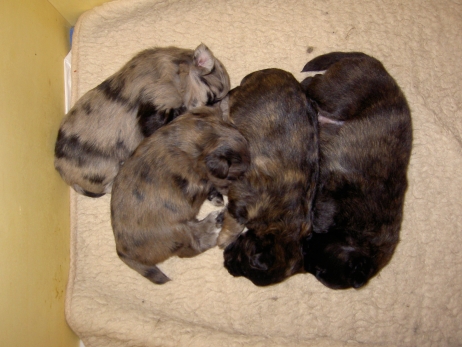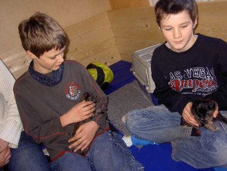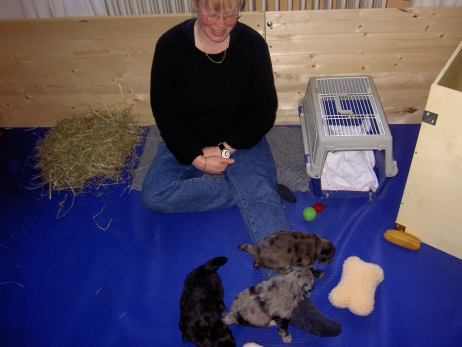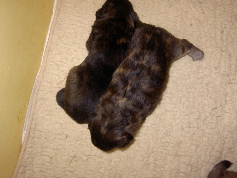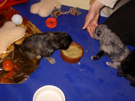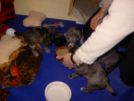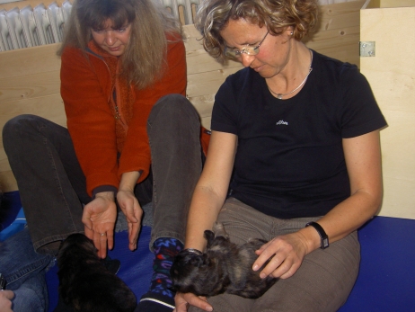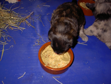 Mahlzeit! Der erste Brei - Welpenfutter, eingeweicht und püriert - steht auf dem Speiseplan. Alle sind neugierig, ich lasse sie ein bißchen von meinem Finger schlecken, das kennen sie schon von der Fleischfütterung. Anor und Aldea haben das Prinzip verstanden, Arda und Aldea gehen erst noch spielen. Dann will Arda auch probieren - und macht das Gesicht des Tages... Wie erwartet schlägt Anor sich den Bauch voll und wird seinem Ruf gerecht. Aber Asea geht auch nicht leer aus. Scheint ihr gar nicht schlecht zu schmecken! Aldea hat sich für ein Verdauungsnickerchen ins Zelt zurückgezogen. Arda hat ausgeschlafen und guckt nach, wer da zu Besuch gekommen ist. Sooo viele Menschen! Da reichen vier Welpen gar nicht für jeden... Und da ich Angst um Aseas Flecken habe, wandert sie zu Beate auf den Schoß - Karin darf nur noch Anor haben, der hat sowieso Streifen. (Karin hatte bei ihrem ersten Besuch angekündigt, alle Flecken wegstreicheln und für sich behalten zu wollen - sehr zu meinem Entsetzen...) Aldea schlummert selig! Was soll man dazu noch sagen??? Asea wollte sich wohl ins Zelt zurückziehen - hat es aber nicht ganz geschafft... Als Ilona einige Stunden später kommt, sind alle wieder wach. Sie bieten sogar eine kleine Showeinlage. Und Anor ist auf halbem Wege aus der Kiste eingeschlafen. Ob das wohl bequem ist??? ![]() Heute mußten die Meerschweinchen etwas von ihrem Heu abgeben. Anor findet das pieksige Zeug ganz interessant, aber auf Karins Schoß ist es doch besser. Und da er ja keine Flecken sondern nur Streifen hat, lasse ich ihn ruhigen Gewissens dort liegen.