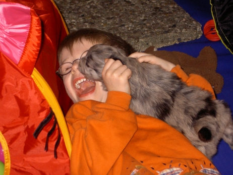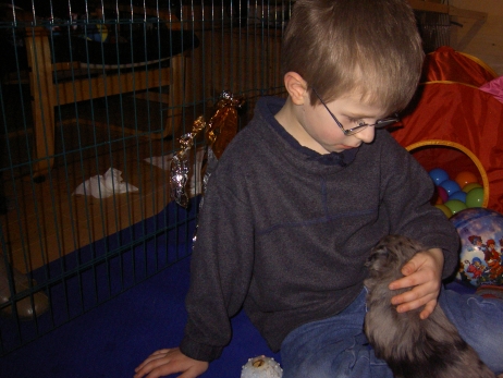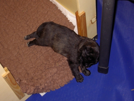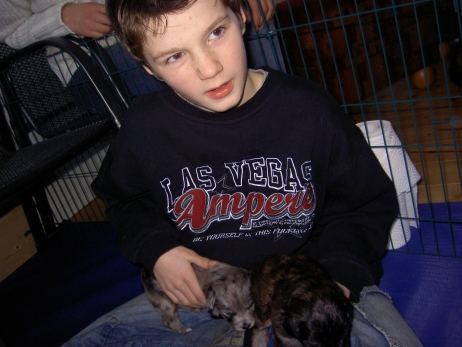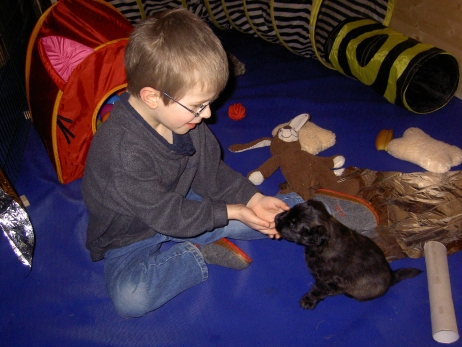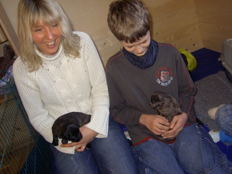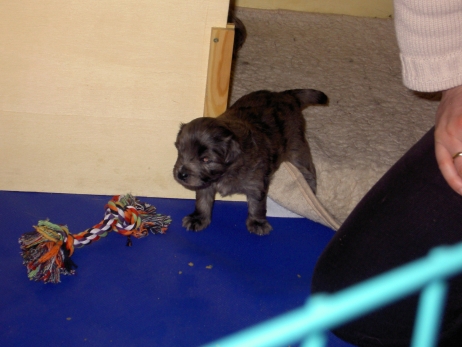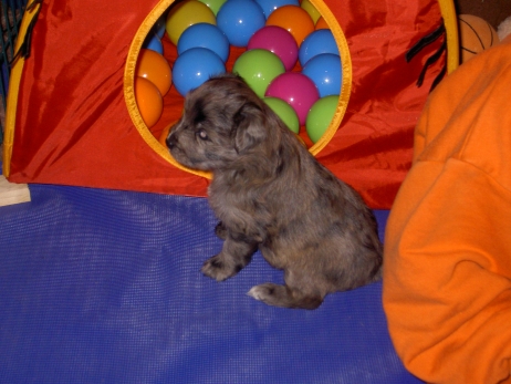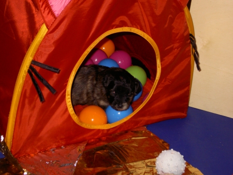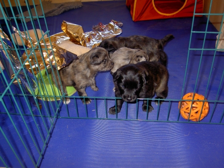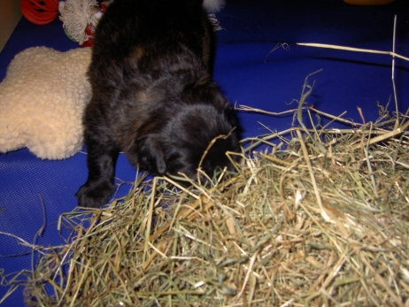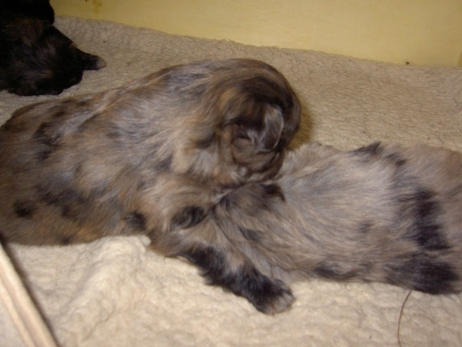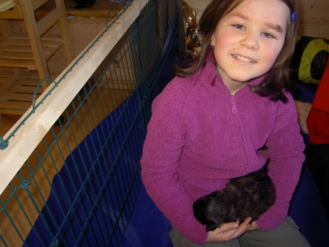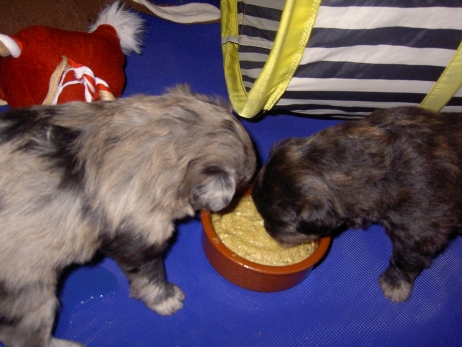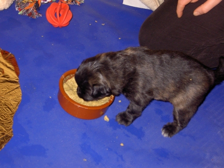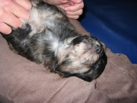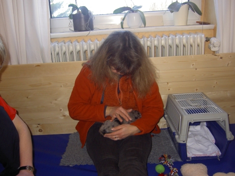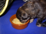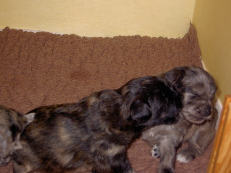 Mahlzeit! Der erste Brei - Welpenfutter, eingeweicht und püriert - steht auf dem Speiseplan. Alle sind neugierig, ich lasse sie ein bißchen von meinem Finger schlecken, das kennen sie schon von der Fleischfütterung. Anor und Aldea haben das Prinzip verstanden, Arda und Aldea gehen erst noch spielen. Dann will Arda auch probieren - und macht das Gesicht des Tages... Wie erwartet schlägt Anor sich den Bauch voll und wird seinem Ruf gerecht. Aber Asea geht auch nicht leer aus. Scheint ihr gar nicht schlecht zu schmecken! Aldea hat sich für ein Verdauungsnickerchen ins Zelt zurückgezogen. Arda hat ausgeschlafen und guckt nach, wer da zu Besuch gekommen ist. Sooo viele Menschen! Da reichen vier Welpen gar nicht für jeden... Und da ich Angst um Aseas Flecken habe, wandert sie zu Beate auf den Schoß - Karin darf nur noch Anor haben, der hat sowieso Streifen. (Karin hatte bei ihrem ersten Besuch angekündigt, alle Flecken wegstreicheln und für sich behalten zu wollen - sehr zu meinem Entsetzen...) Aldea schlummert selig! Was soll man dazu noch sagen??? Asea wollte sich wohl ins Zelt zurückziehen - hat es aber nicht ganz geschafft... Als Ilona einige Stunden später kommt, sind alle wieder wach. Sie bieten sogar eine kleine Showeinlage. Und Anor ist auf halbem Wege aus der Kiste eingeschlafen. Ob das wohl bequem ist??? ![]() Heute mußten die Meerschweinchen etwas von ihrem Heu abgeben. Anor findet das pieksige Zeug ganz interessant, aber auf Karins Schoß ist es doch besser. Und da er ja keine Flecken sondern nur Streifen hat, lasse ich ihn ruhigen Gewissens dort liegen.