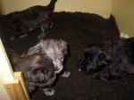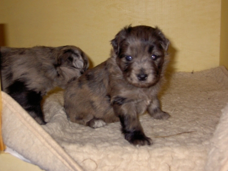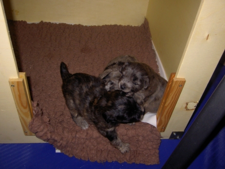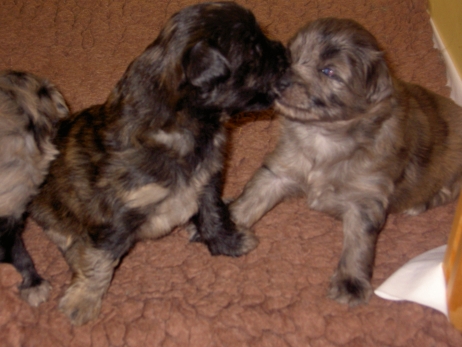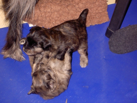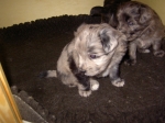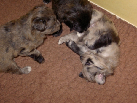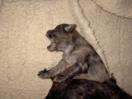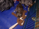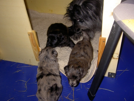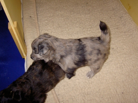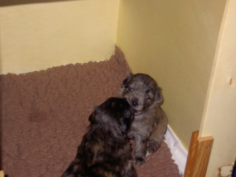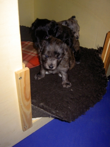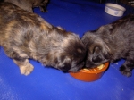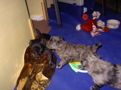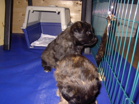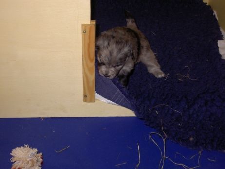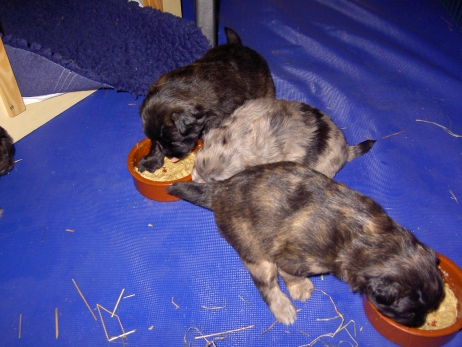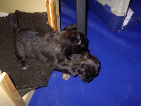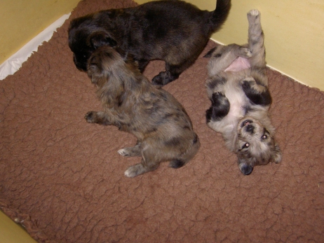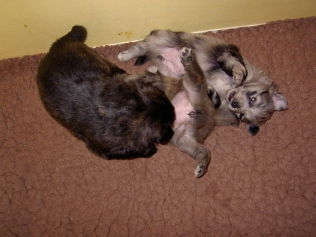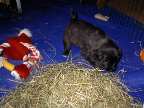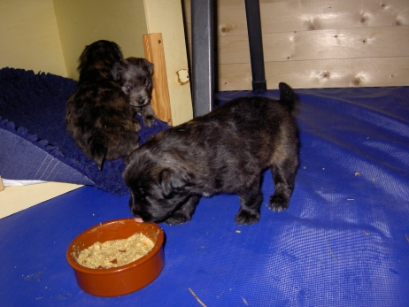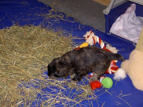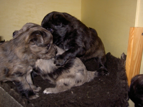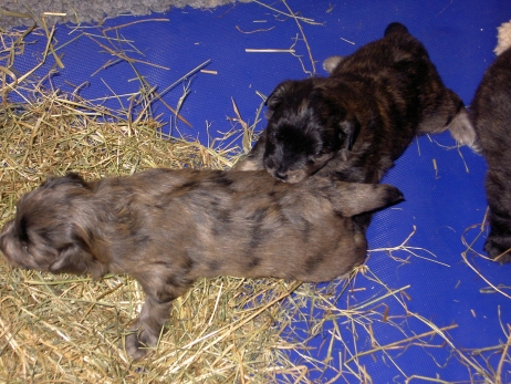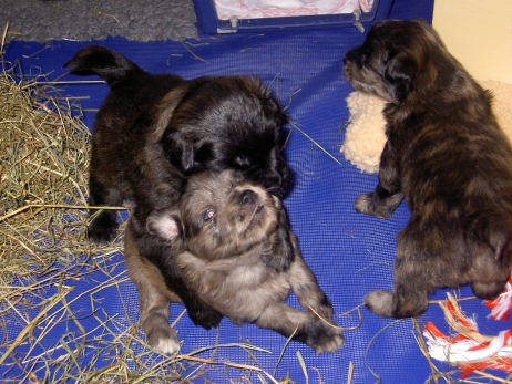 Mit jedem Tag werden sie munterer, die Wachphasen werden immer länger und häufiger. Spielerische Ringkämpfe stehen auf dem Progamm, noch recht schmerzlos, bisher sind nur Anors Zähne durchgebrochen. Na ja, zwar nur die oberen Vorder- und Fangzähne, aber immerhin! Hier messen aber Aldea und Arda ihre Kräfte, völlig zahnlos. Die Sache mit dem Brei klappt auch schon deutlich besser, fast professionell schlabbern sie am Napf. Und als alle satt sind, holt Anor sich noch einen Nachtisch. Alles, was nicht binnen weniger Minuten aufgegessen ist, bekommen Digger und Bonny. Aber bei Mama schmeckt es nach wie vor am Besten! Arda und Asea machen ein Wettrennen mit unfairen Spielregeln - die Schwester einfach zu Boden schmeißen ist nicht die damenhafte Art! Aldea schnüffelt ein wenig im Heu Jetzt parkt Arda auch noch ihren Popo auf ihrer Schwester! Aber da kommt Anor von hinten und zeigt Arda, wo der Hammer hängt. Asea kämpft inzwischen lieber mit der Decke - die gibt wenigsten keine Widerworte! Arda erkundet das Heu, Aldea nimmt eine Geschmacksprobe von Arda. Die pieksigen Halme sind aber auch interessant! In der Kiste gehen die Kämpfe in die nächste Runde... ...ich nehme noch Wetten an! |