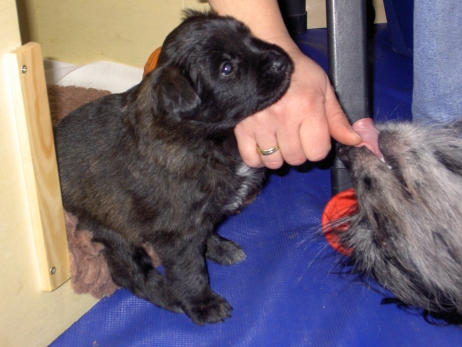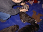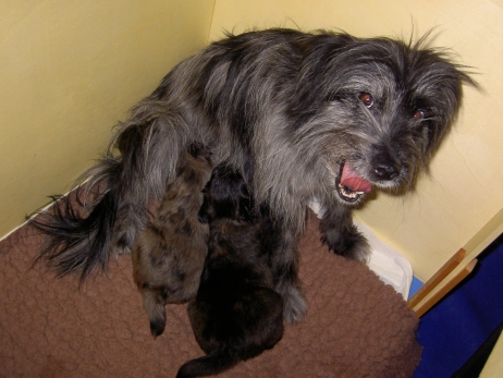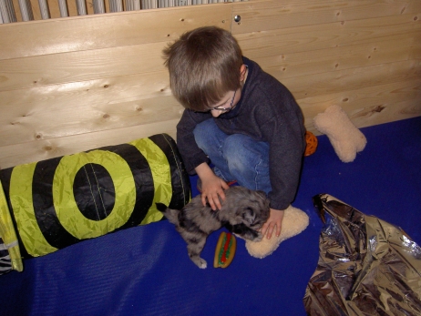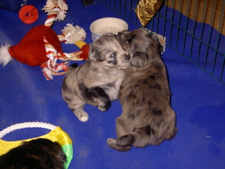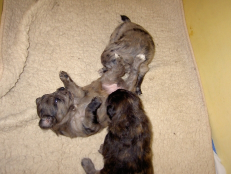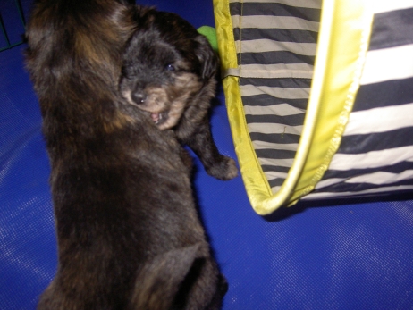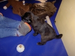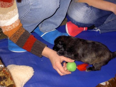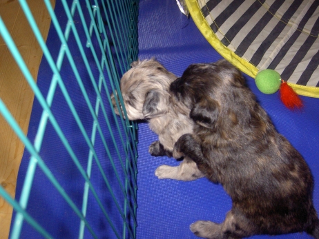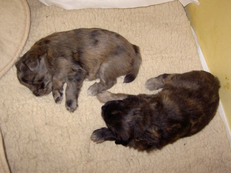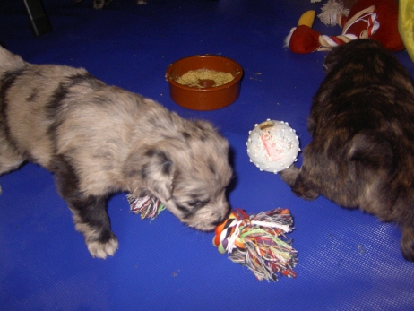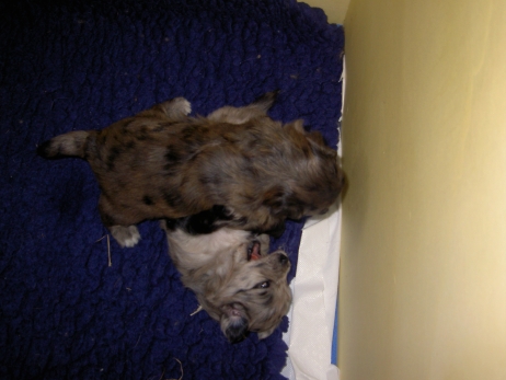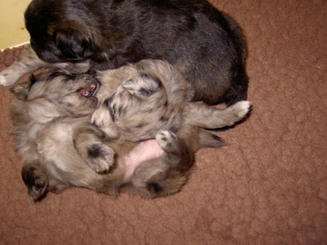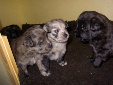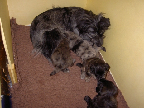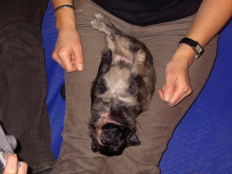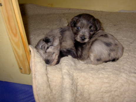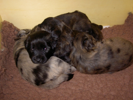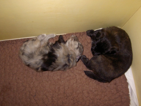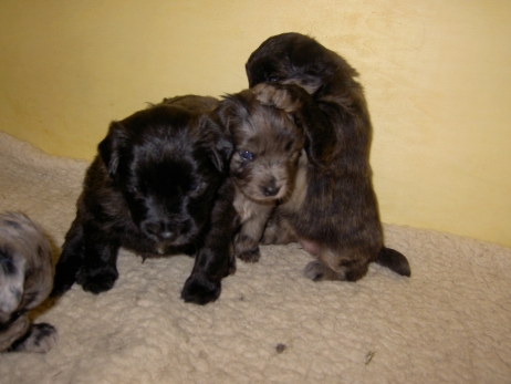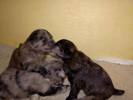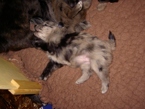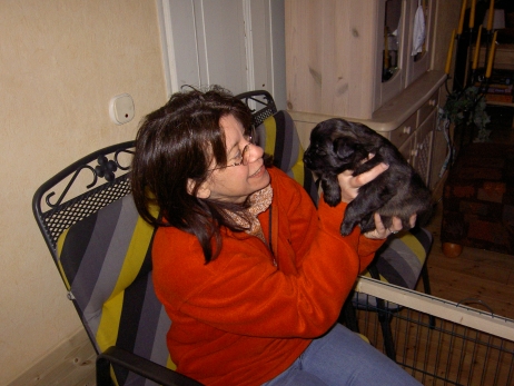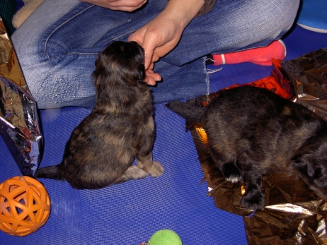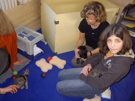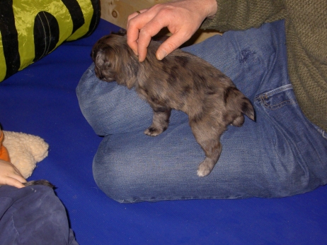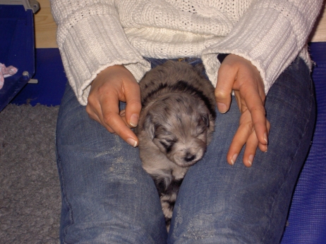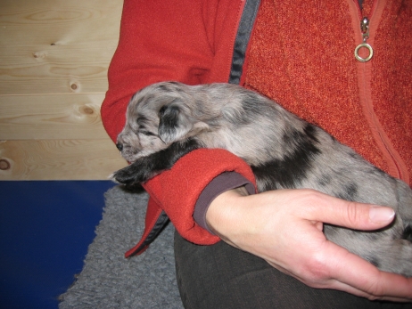 Der erste Tag der vierten Lebenswoche! Nun beginnt die Sozialisierungsphase und passend haben sich einige Besucher für das Wochenende angekündigt. Anor hält schon Ausschau und wird mit dem Logenplatz auf Steffis Arm belohnt. Aber auch Arda und Aldea gefällt es prima. Besonders Aldea mag sich gar nicht trennen und auch Asea darf kuscheln. Hach, ist das gemütlich! Und Anor bekommt wieder Besuch von seiner zukünftigen Familie. Er macht sich auch gleich "Lieb-Kind". Ein echter Charmeur! Aldea will nicht hinten anstehen und holt sich auch ihre Streicheleinheit - - und noch eine... Zurück in der Kiste ist Damenringen angesagt. Arda und Aldea messen ihre Kräfte. Arda macht seltsame Dinge. Kommt da ein verstecktes "Kampfhunderbe" ans Tageslicht? Aber eigentlich ist sie ganz friedlich - solange Asea sich so nett als Ruhekissen zur Verfügung stellt. Die drei Damen vom Grill halten ein Nickerchen. Und Anor nickert natürlich gerne mit! Videos!! --> hier: NEU -> Video 1 NEU -> Video 2 NEU -> Video 3 NEU -> Video 4 |