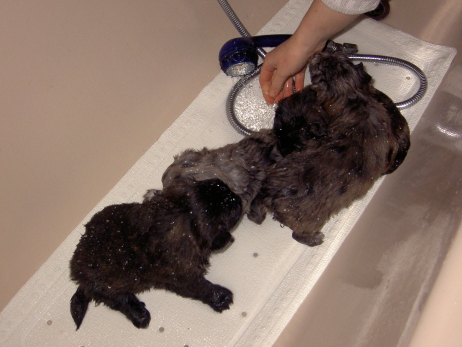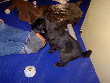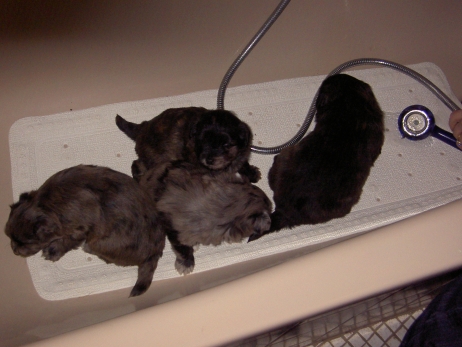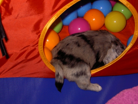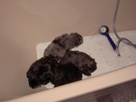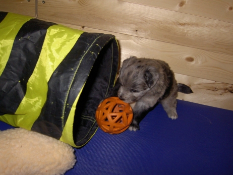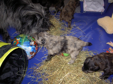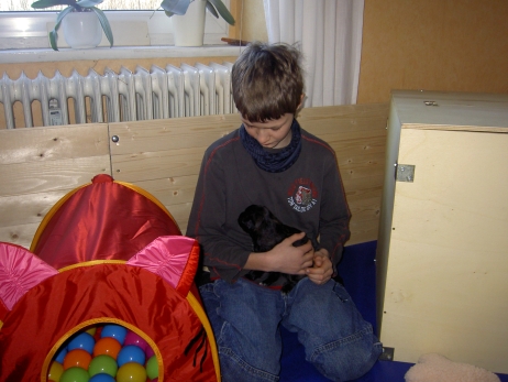 Katrin war soooo lange nicht da und hat Sehnsucht nach ihrem Anor. Am Liebsten würde sie ihn ja schon mitnehmen, aber bevor sie fährt, zähle ich alle Welpen noch mal durch. Sind noch alle da - Anor fühlt sich im Kreise seiner Schwestern auch noch sichtlich wohl. Obwohl - bei Katrin ist es offensichtlich auch ganz nett. In meiner Badewanne bin ich Kapitän. Oder Kapitöse. Oder so. Damit die Kleinen mal was anderes sehen als immer nur Welpenauslauf - blau - habe ich sie zwecks Wassergewöhnung auf eine rutschfeste Unterlage in die Badewanne gesetzt und den Brausekopf laufen lassen. Im Auslauf steht bereits seit einiger Zeit ein Näpfchen mit Wasser, sie treten zwischendurch immer mal rein. So ist ihnen das nasse Element nichts Unbekanntes mehr. Nach kurzer Zeit scheint ihnen das warme Wasser aus dem Duschkopf durchaus angenehm zu sein. Frisch gebadet und blank poliert - zum Glück sind die Punkte nicht nur streichel- sondern auch wasserfest. Da kann man doch gleich wieder zur Attacke blasen! Asea übt schon mal Bällchen spielen - die Kleinen entwickeln immer mehr Bezug zu ihrem (täglich wechselnden) Spielzeug. Es wird mittlerweile eifrig durch die Gegend gezerrt, heftig geschüttelt und erbittert angeknurrt. Ganz gefährliche Bestien sind das hier - nur Bletta findet das Ganze echt zum Gääääähnen. Aber es nützt nichts, zwischendurch muß sie sich noch als Bar zur Verfügung stellen. Asea hat da irgendwie den Anschluß verloren. Gefährliche Bestien, wie gesagt! Die wollen doch nur spielen! Die tun nix! Aldea hält sich raus und kämpft lieber mit dem Knistertunnel. Will auch immer lieb sein! Können diese Augen lügen? Arda ist das egal, wer schläft, sündigt sowieso nicht. Auch Asea und Anor gehen auf Nummer sicher. Nur Aldea übt noch den richtigen Blick für ihre neuen Besitzer. Wer kann da schon widerstehen? Und die passenden Videos mit Geräuschkulisse: NEU -> Video 1 NEU -> Video 2 |