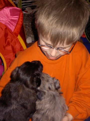Frühstückszeit! Mittlerweile schlagen sich alle gierig am Napf die Bäuche voll. Und anschließend wird gerne noch ein Spielchen gemacht. Asea - auf zu neuen Taten! Aber Anor und Aldea haben sie eingefangen. Der frißt sie auf!!!! Aber er will ja nur spielen... Arda, Asea und Anor halten Kaffeeklatsch. Sie besprechen ausführlich, was noch so ansteht. Laurin ist völlig begeistert, daß immer mehr Action geboten wird. Ja, Aldea hat auch noch die Augen auf. Und Arda tötet Harry den Hasen. Von wegen, der Berger hat keinen Jadgtrieb... Aldea stürzt sich auch auf den Hasen, Asea würde gerne, aber Laurin hat gerade andere Pläne. Dafür nimmt Anor eine Geschmacksprobe von Laurins Puschen. Und - was machen wir jetzt??? Hallo, ich heiße Laurin Lange - bist Du der Anor? Da soll noch mal einer sagen, Kinder und Hunde gehören nicht zusammen... Anor hält Ausschau. Ein flotter Dreier. |