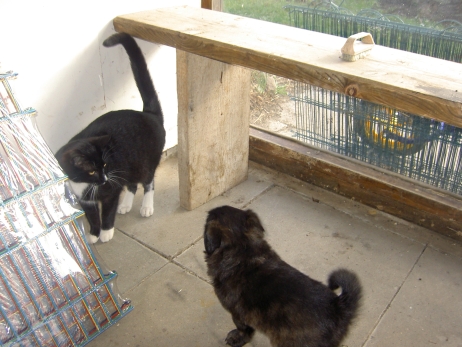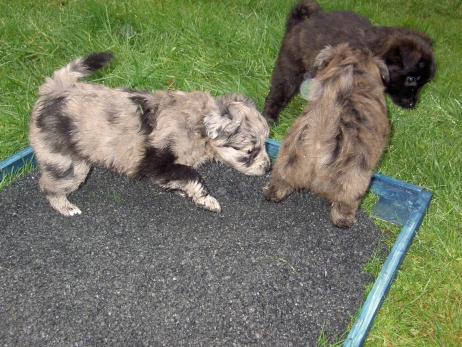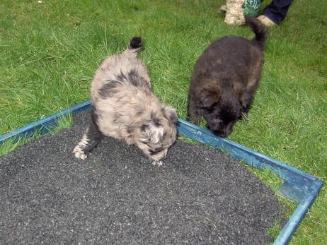 Das Wetter läßt schwer zu wünschen übrig - es nieselt den ganzen Tag! Aber einen echten Pyrenäen-Hütehund kann das natürlich nicht schocken, und deswegen heißt es für die Kleinen: Ab nach draußen und den neuen Auslauf erkunden! Frei nach dem Motto: Sich regen im Regen. Wir haben für die kleinen Bestien im Garten einen großen Auslauf eingerichtet, mit Wackelbrett, Unterschlupf, Sand- und Kieskiste und vielem mehr. Ganz nach Belieben können sie in unseren "Wintergarten", den wir mit Heu und Liegeplatz ein wenig kuschelig hergerichtet haben. Asea kann gar nicht schnell genug hin und herlaufen, um sich alles anzusehen. Nicht die Pyrenäen, aber für's erste auch nicht schlecht: Ein Steinhaufen muß genau erkundet werden. Arda und Anor sind schon fertig mit gucken und fechten wilde Kämpfe aus - echte Bestien eben... Unsere Nachbarin läßt sich das Spektakel nicht entgehen! Dabei hat Sabine eigentlich Angst vor Hunden... Aldea tut ganz unschuldig, während Anor sich gleich von seiner besten Seite zeigt - der geht auf Kehle! Na ja, vorerst begnügt er sich noch mit dem Schal... Der größte Auslauf ist nicht groß genug, wenn ein Zaun drumherum ist... Anor und Aldea toben durch's Heu. Und alle toben mit Laurin. Das Leben ist schöööööön! |